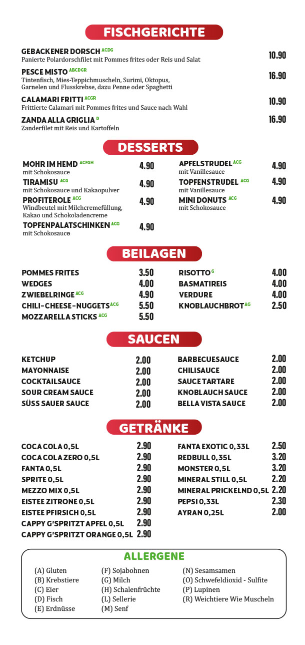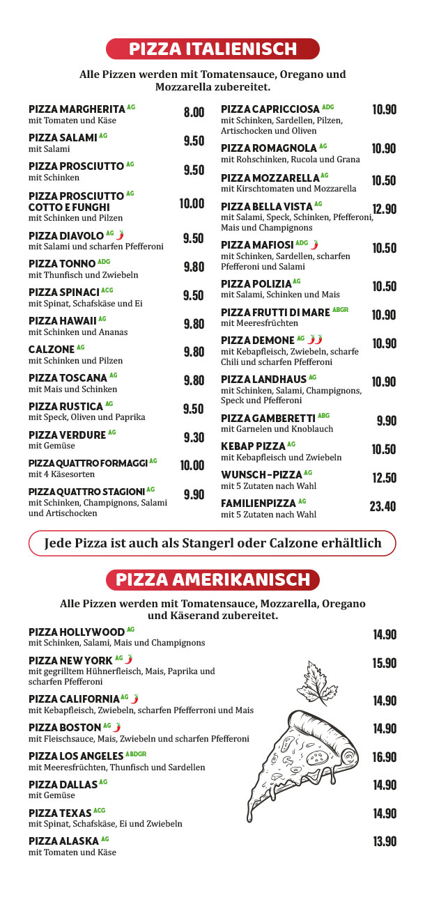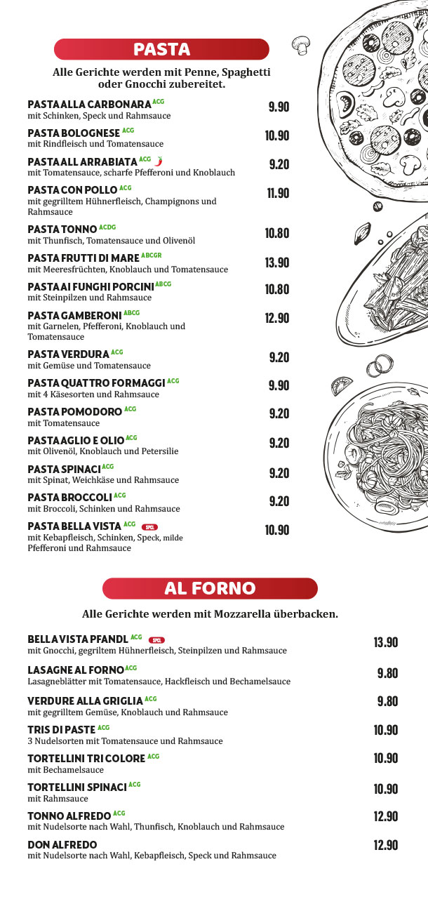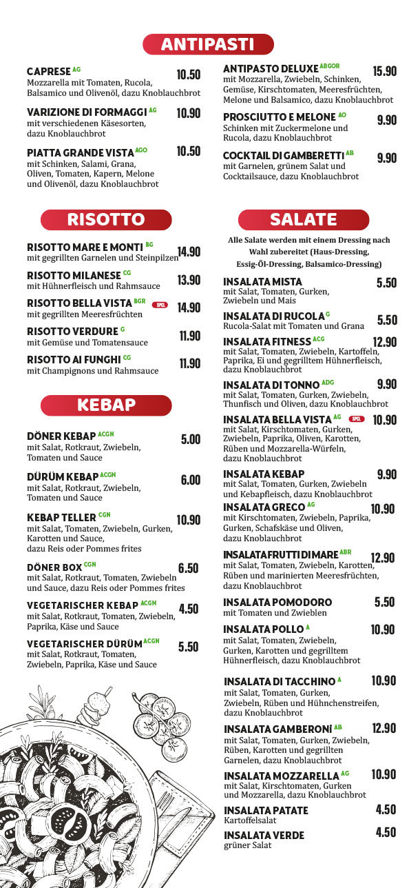 Hier finden Sie unsere vielfältige Auswahl an Gerichten. Von Antipasti über Pizzen und Burger bis hin zu Kebap und Nudelgerichten - alle unsere Speisen werden aus frischen Zutaten zubereitet.